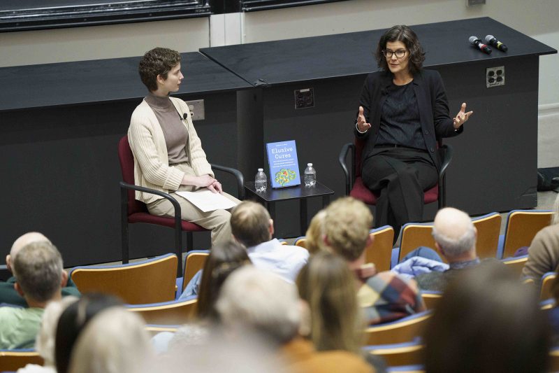 “Elusive Cures” author Nicole Rust (right) speaks at Harvard Science Center.